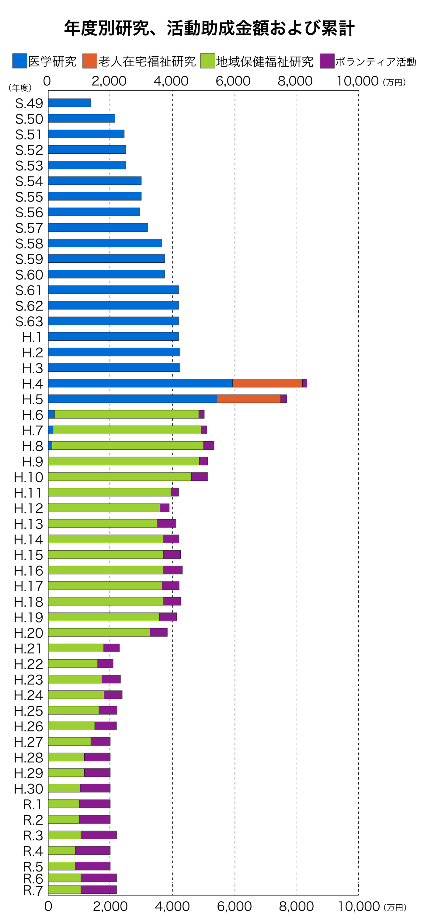 | 年度 | 医学研究 | 老人在宅福祉研究 | 地域保健福祉研究 | ボランティア活動 | 合計 | |||||